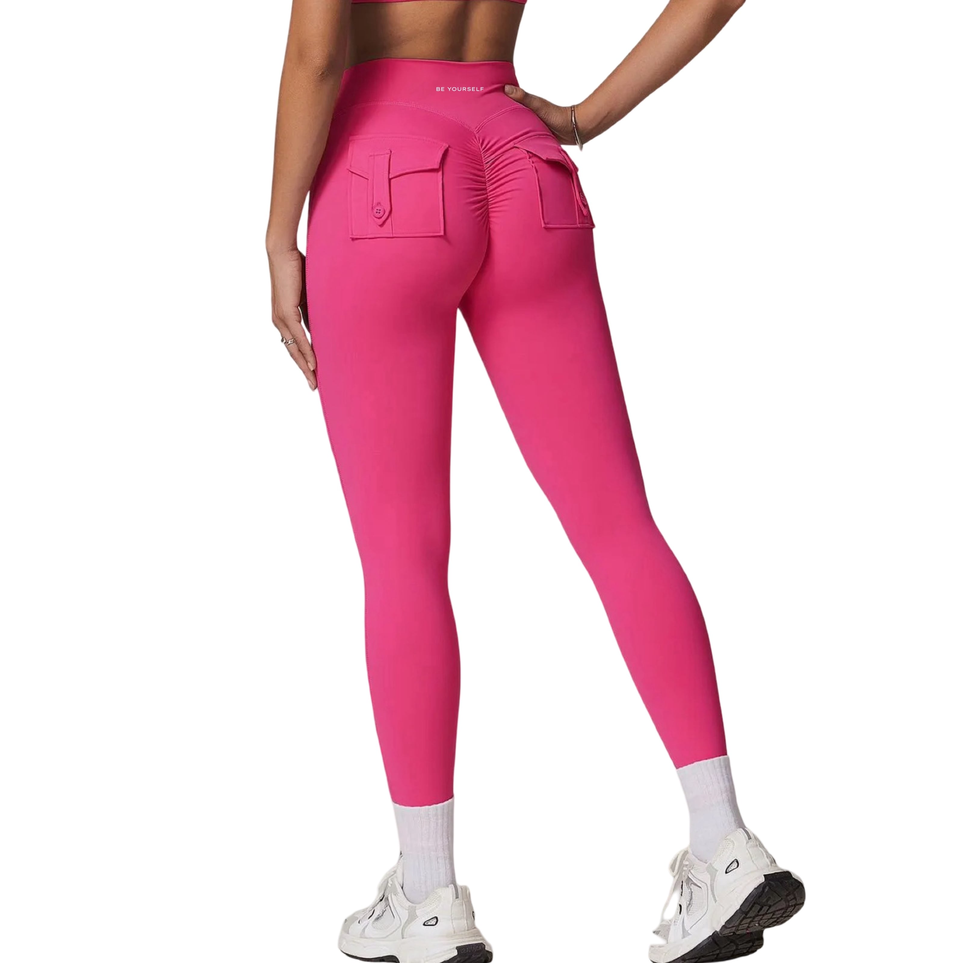 高めにつけられたポケットとスクラッチの効果でお尻が高く大きく見える魔法のレギンス!