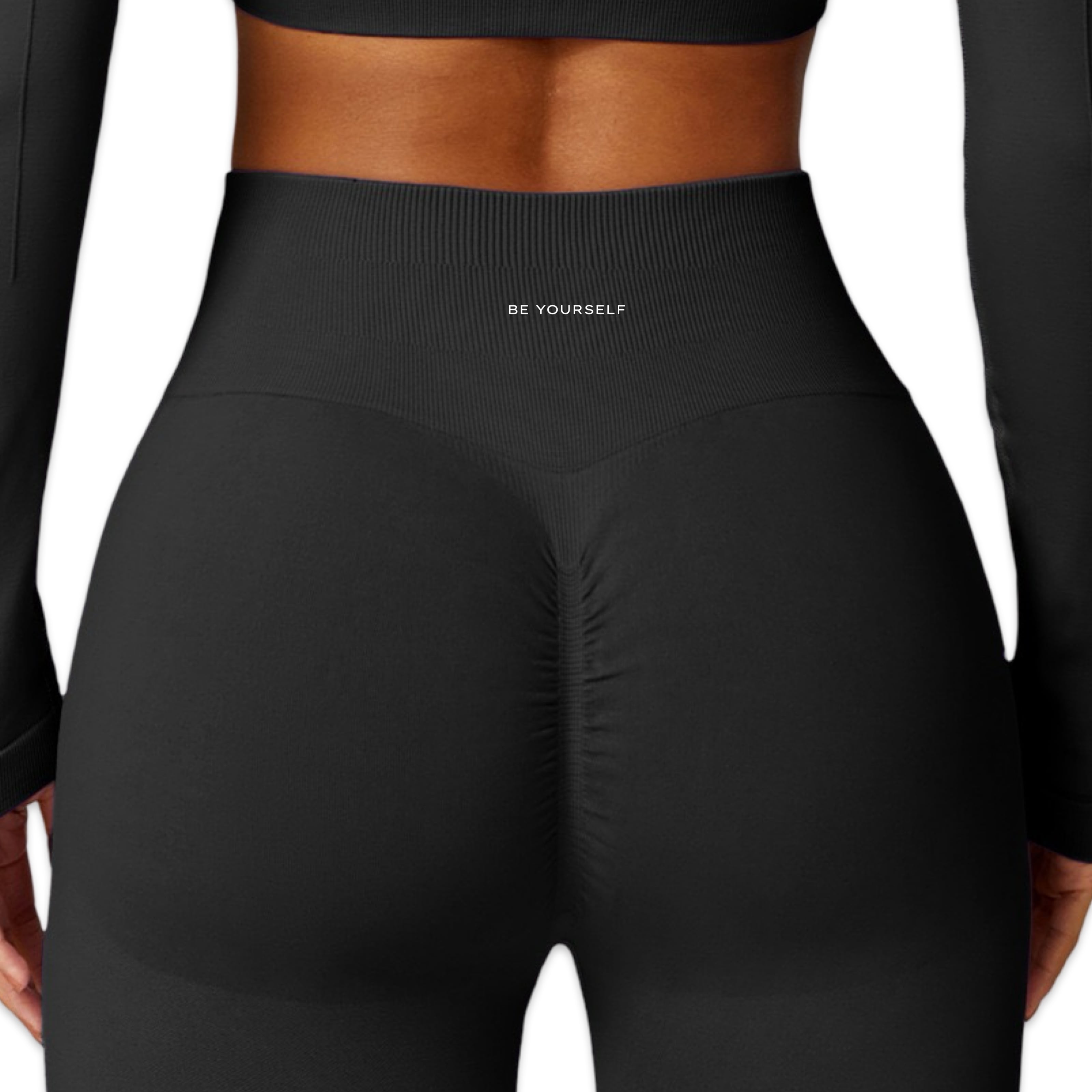 しっかりとした分厚い安心感のある生地感。お尻が盛れる定番のデザイン×シームレス×フレア。